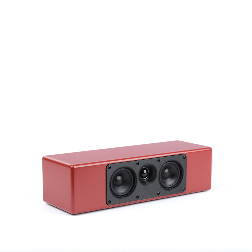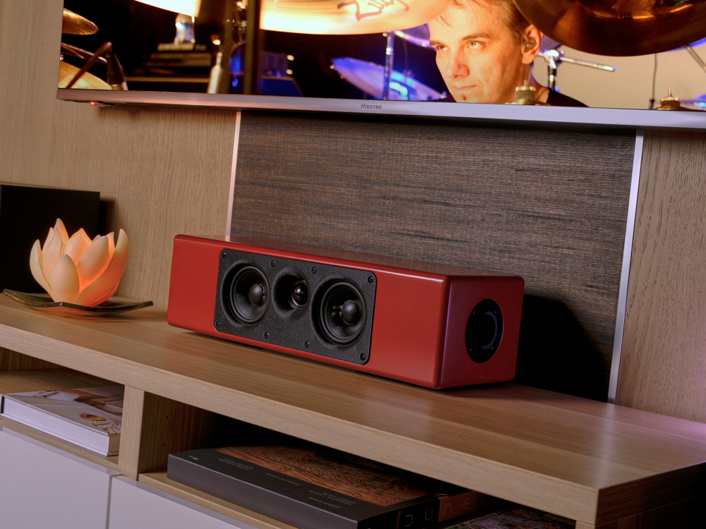 Enceinte centrale 2 voies Bass-Reflex, avec platine regroupant les guides d’onde du tweeter et des deux haut-parleurs médium.
