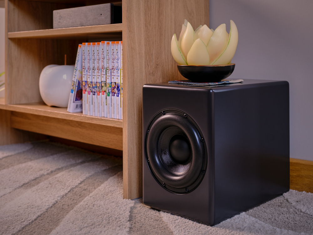 Caisson de grave passif clos ultra compact équipé d’un unique haut-parleur de 6 pouces et d’un double bornier pour chainer les caissons deux à deux.